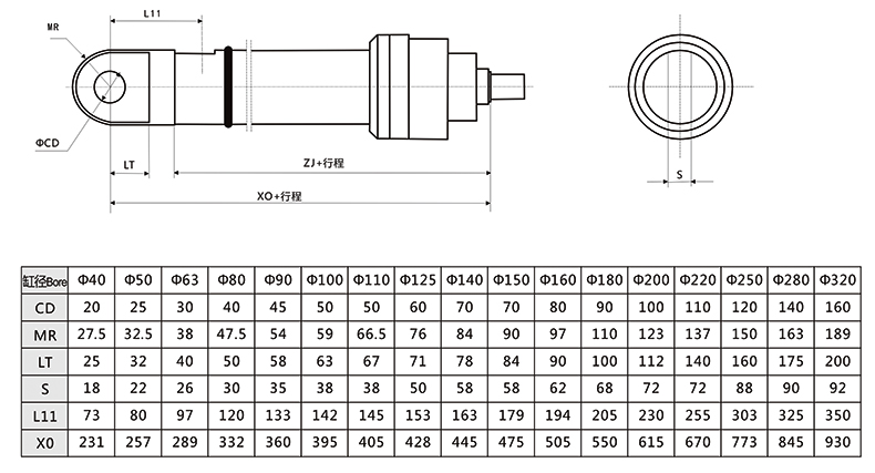 冶金液壓缸尾部單耳環外形安裝尺寸圖