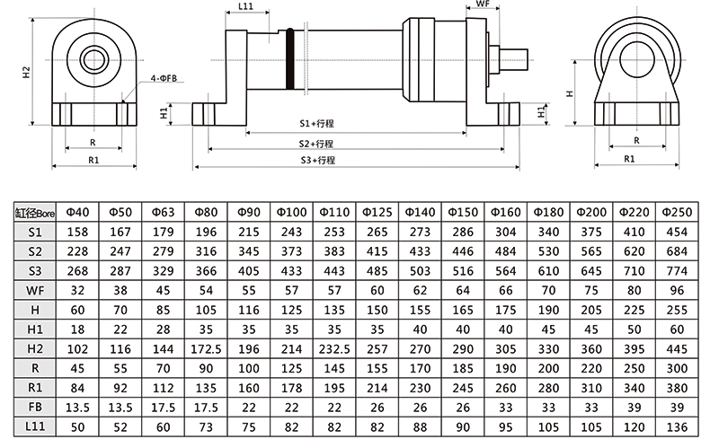 冶金液壓缸軸向腳架外形安裝尺寸圖